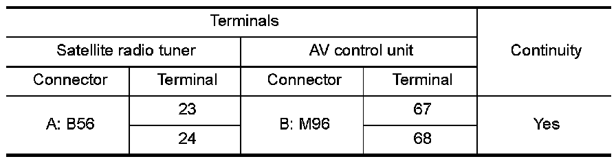 3. Check continuity between satellite radio tuner and AV control unit.