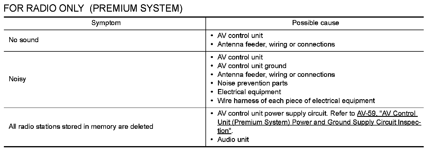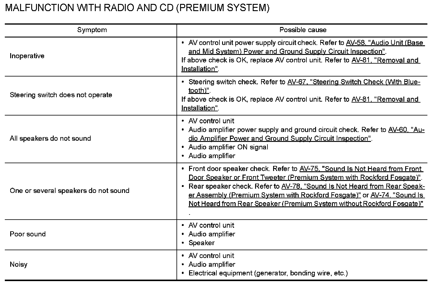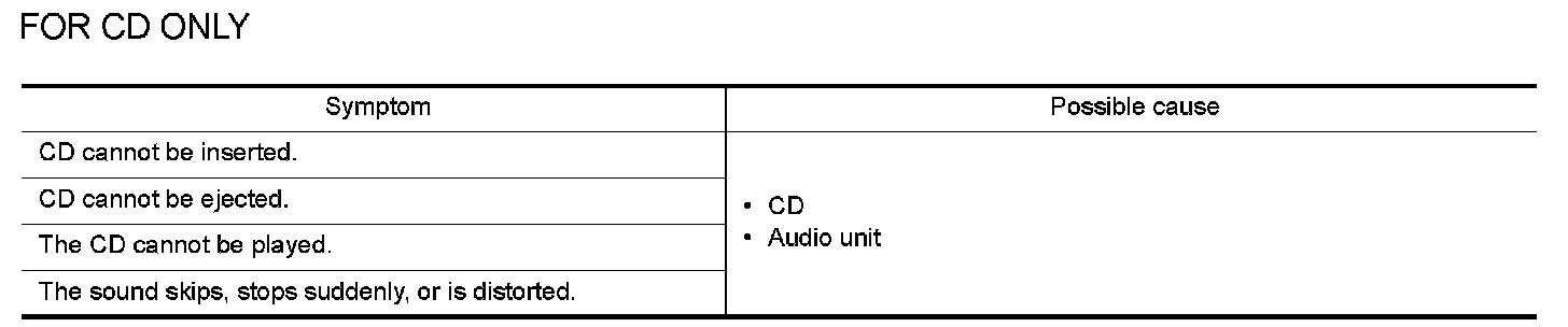 The majority of the audio troubles are the result of outside causes (bad CD, electromagnetic interference, etc.). Check the inspection items below to diagnose the malfunction.