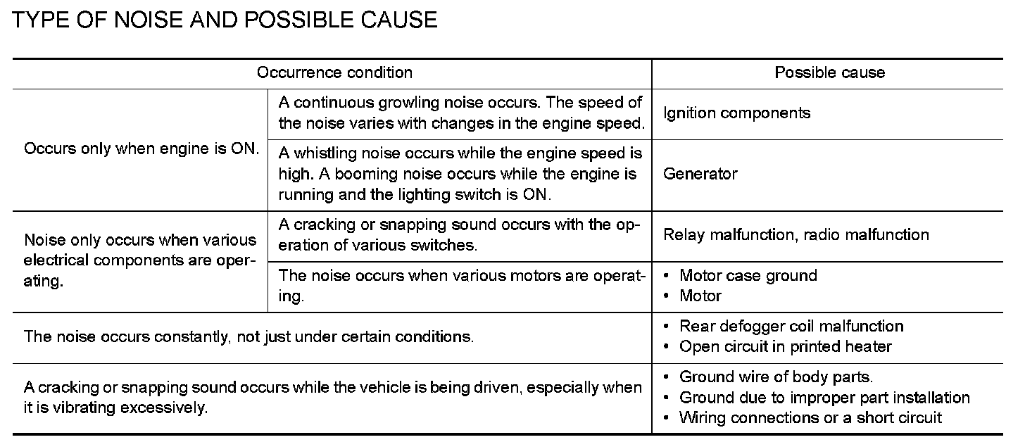 The vehicle itself can be a source of noise if noise prevention parts or electrical equipment is malfunctioning.
