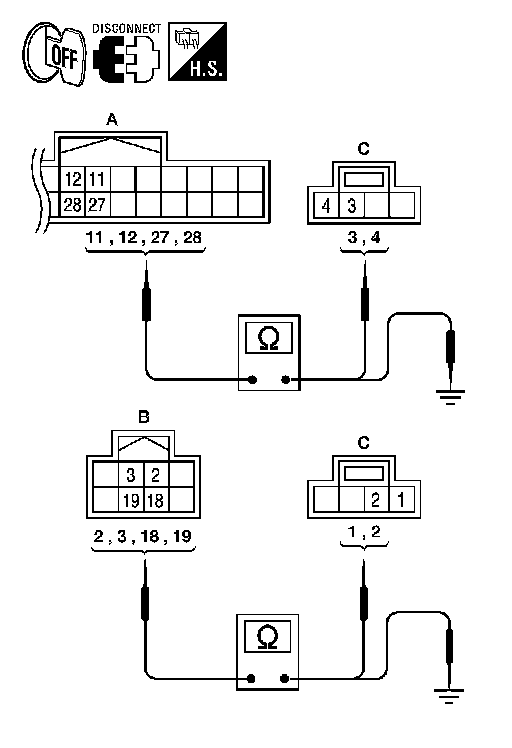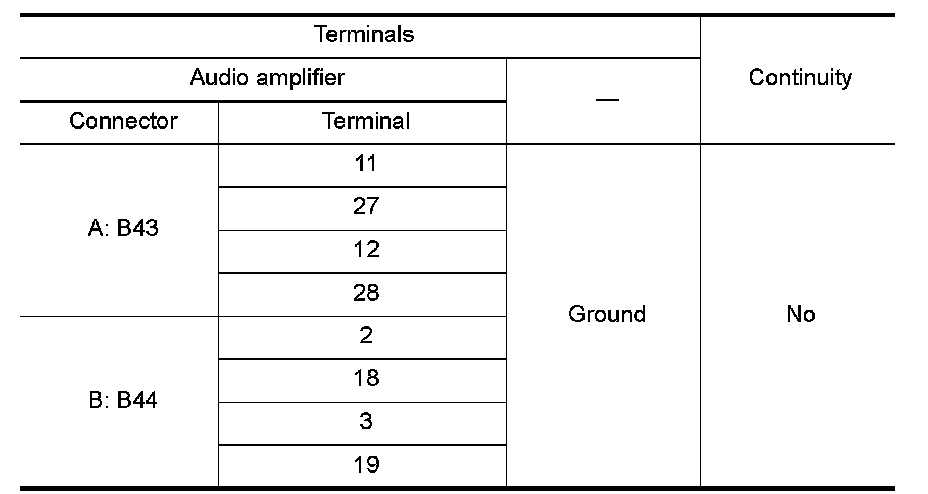 4. Check continuity between audio amplifier harness connector terminals and ground.