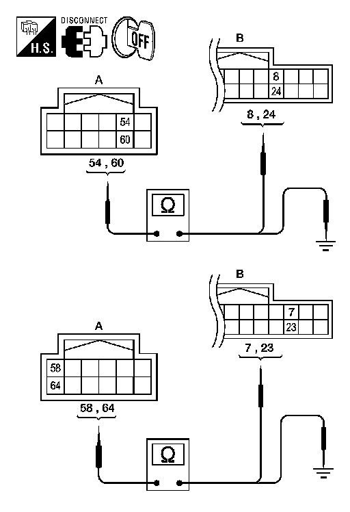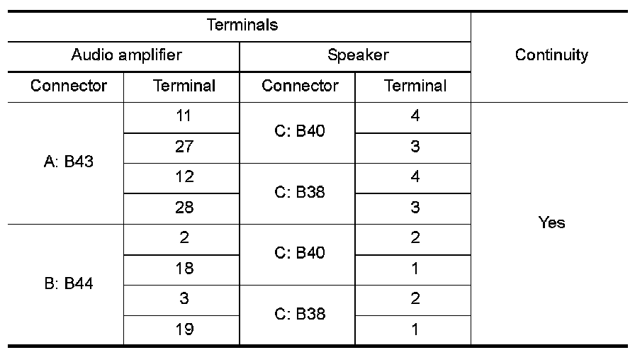 3. Check continuity between audio amplifier harness connector terminal and suspect speaker harness connector terminal.