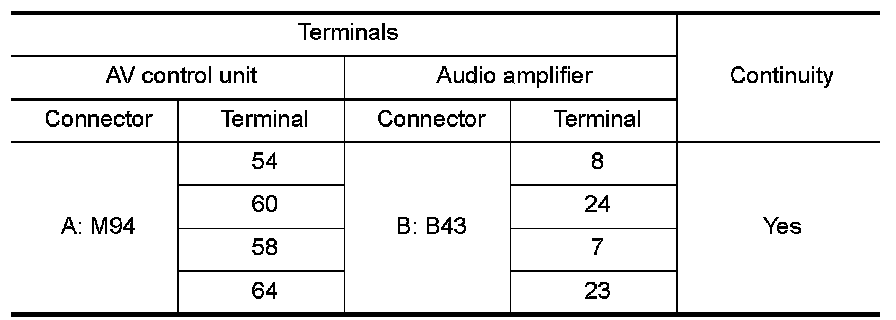 3. Check continuity between AV control unit harness connector terminals and audio amplifier harness connector terminals.