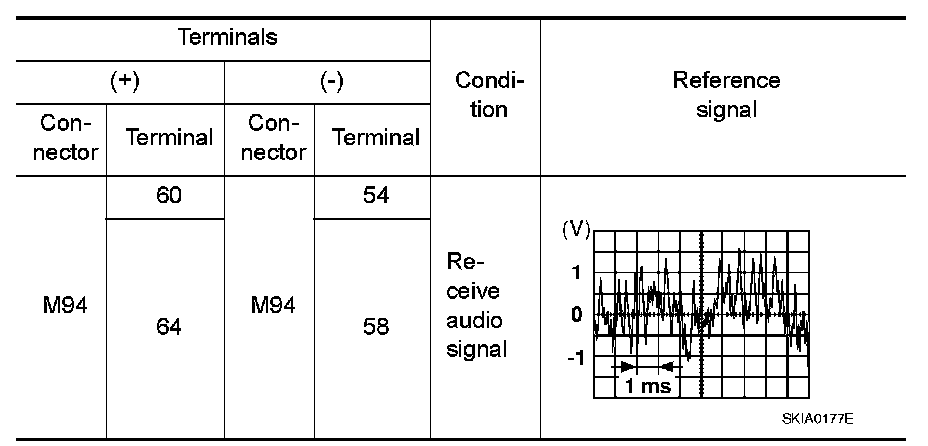 4. Check the signal between audio unit harness connector terminals with CONSULT-III or oscilloscope.