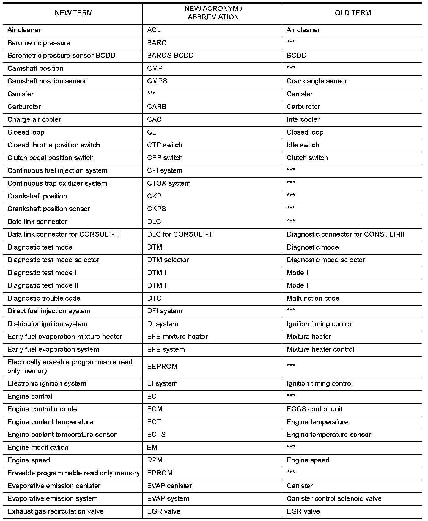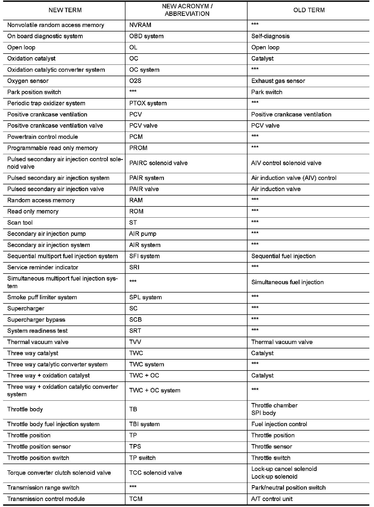All emission related terms used in this publication in accordance with SAE J1930 are listed. Accordingly, new terms, new acronyms/abbreviations and old terms are listed in the following chart.