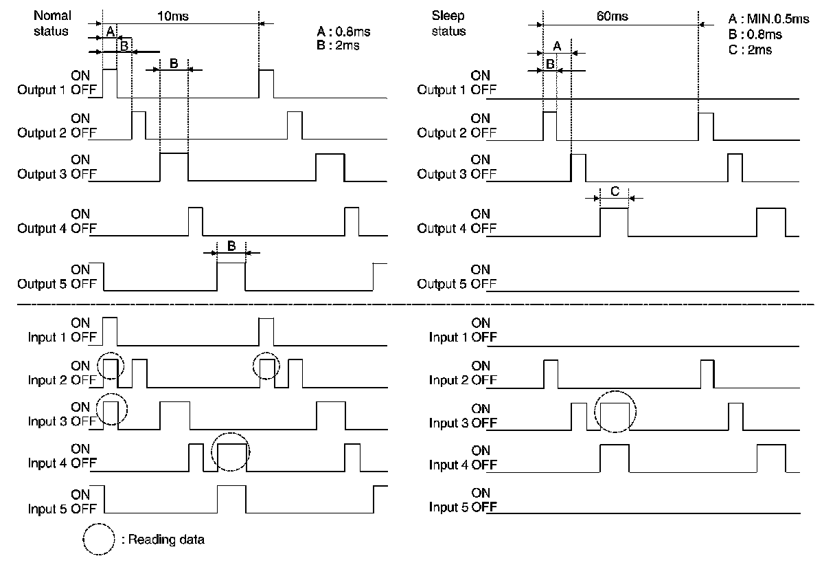 - When BCM is not in sleep status, OUTPUT terminals (1-5) each turn ON-OFF every 10ms.