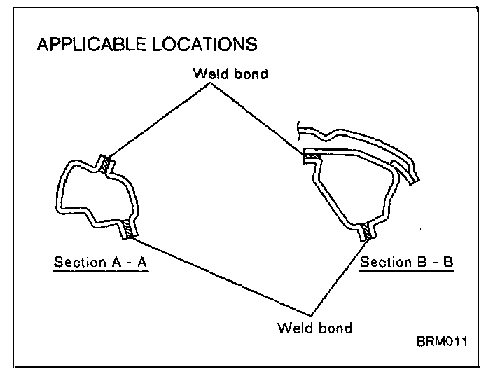 - When any of these parts are replaced, weld bond must be applied to the mating surfaces on the panel. If these panel parts are fixed with MIG welding, avoid applying weld bond around MIG weld holes.