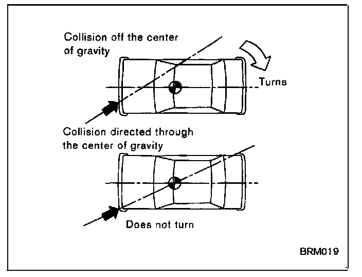 If the impact force is applied away from the center of gravity, a moment of rotation is caused which absorbs the impact force. If the force aims at the center of gravity, no such moment is caused and the resultant damage will be greater.