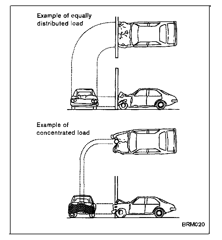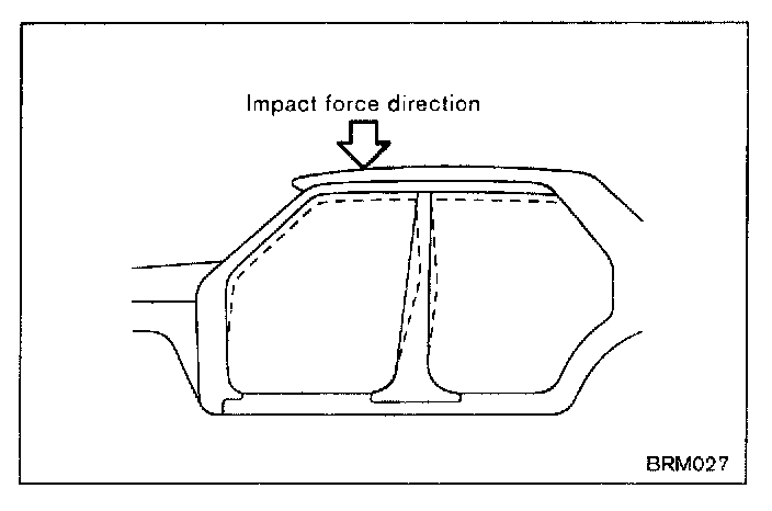 Small impact is absorbed with the roof and roof bow. If the impact is great, it is also absorbed with the pillars. However, broken glass and a deformed rear fender may result.