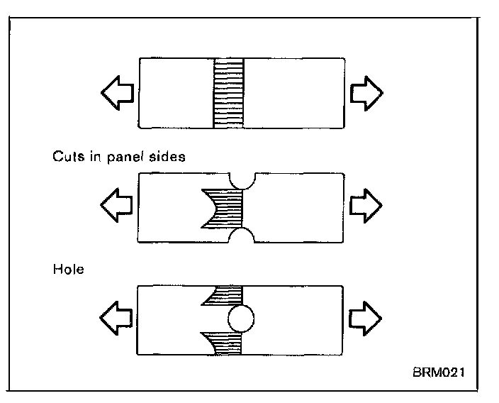If a panel has cuts or holes, stress distribution will be uneven. As shown in the figure to the right, stress concentrates where the sectional shape changes, thus producing deformation.