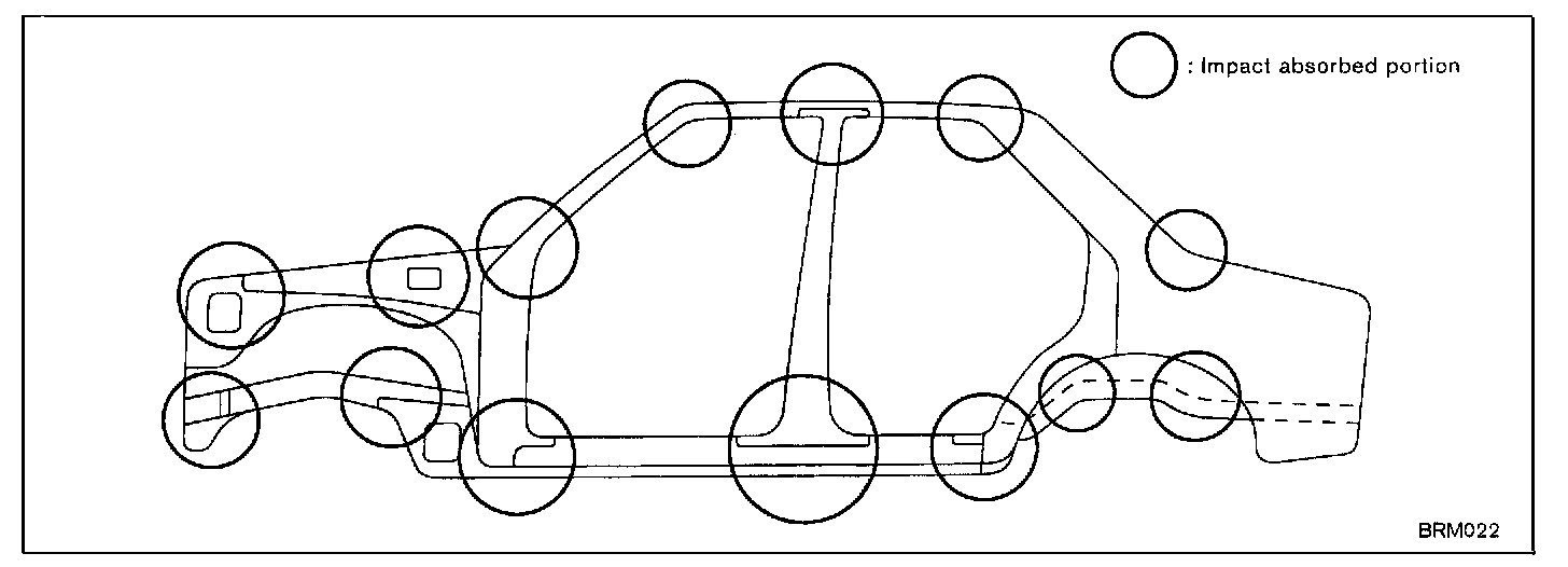 Impact force is absorbed at the circled portions in the figure. The panels may be damaged up to these portions according to the magnitude of impact.