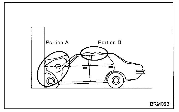 The body panel may be damaged indirectly by inertia. Portion A in the figure is the direct damage, and portion B shows a type of indirect damage. Therefore, it is necessary to closely check for both types of damage.