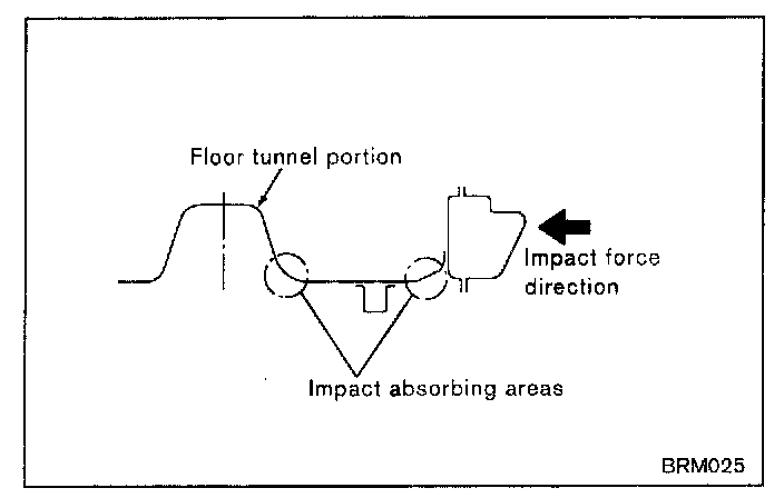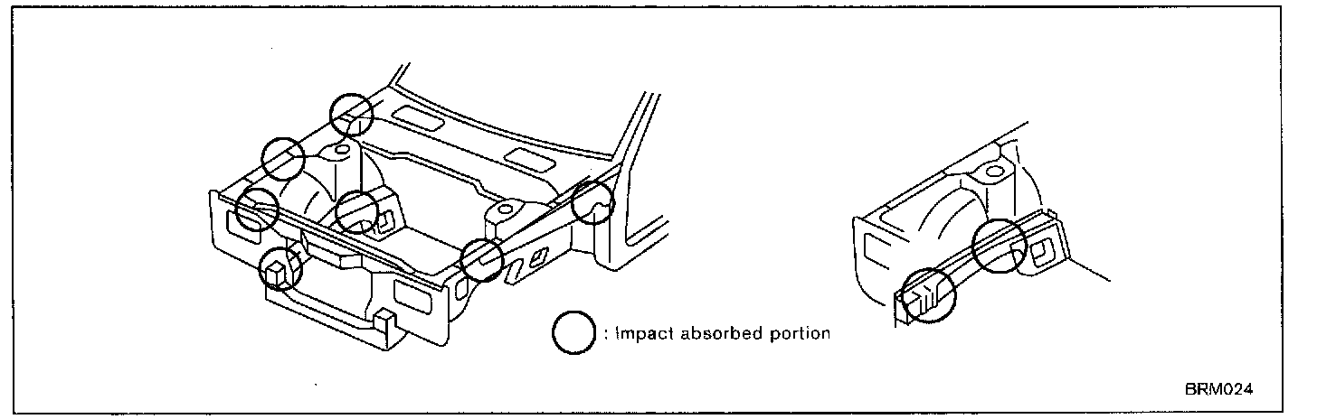 Impact force is absorbed at the circled portions in the figure. If it is not absorbed completely impact damage can propagate to the dash panel.