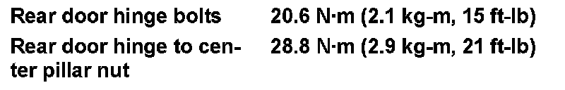 Front door hinge bolts 20.6 N.m (2.1 kg-m, 15 ft-lb)
