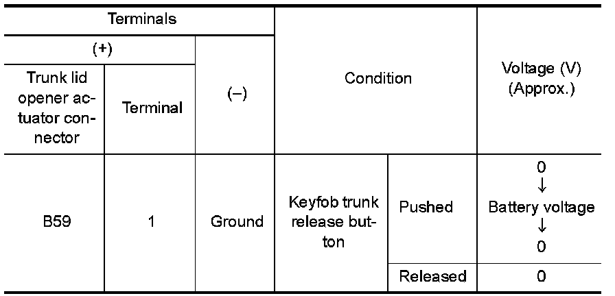 3. Check voltage between trunk lid opener actuator connector B59 terminal 1 and ground.
