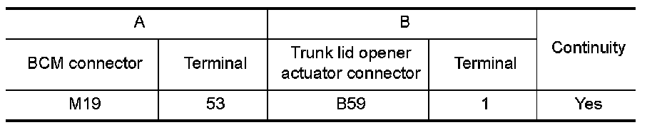 2. Check continuity between BCM connector M19 (A) terminal 53 and trunk lid opener actuator connector