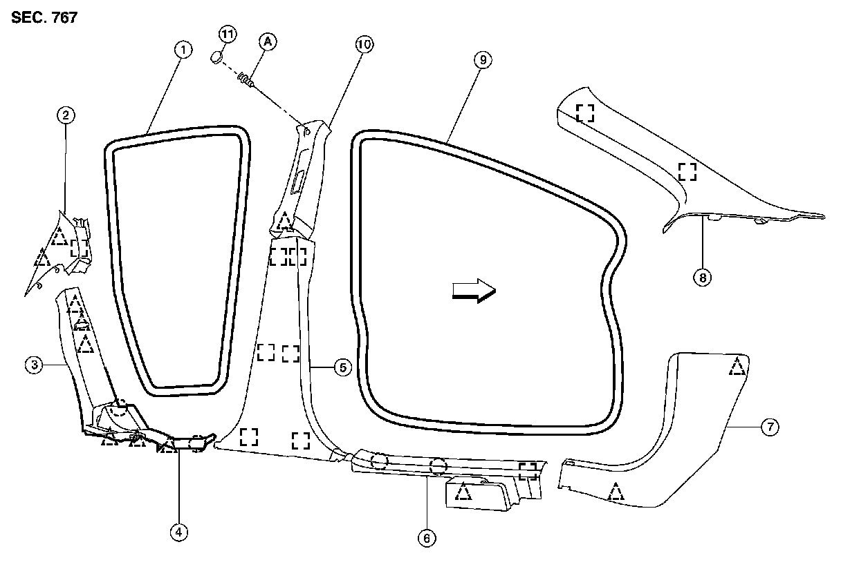 - Make sure clips are properly aligned in panel holes on body when installing, then press them in completely.