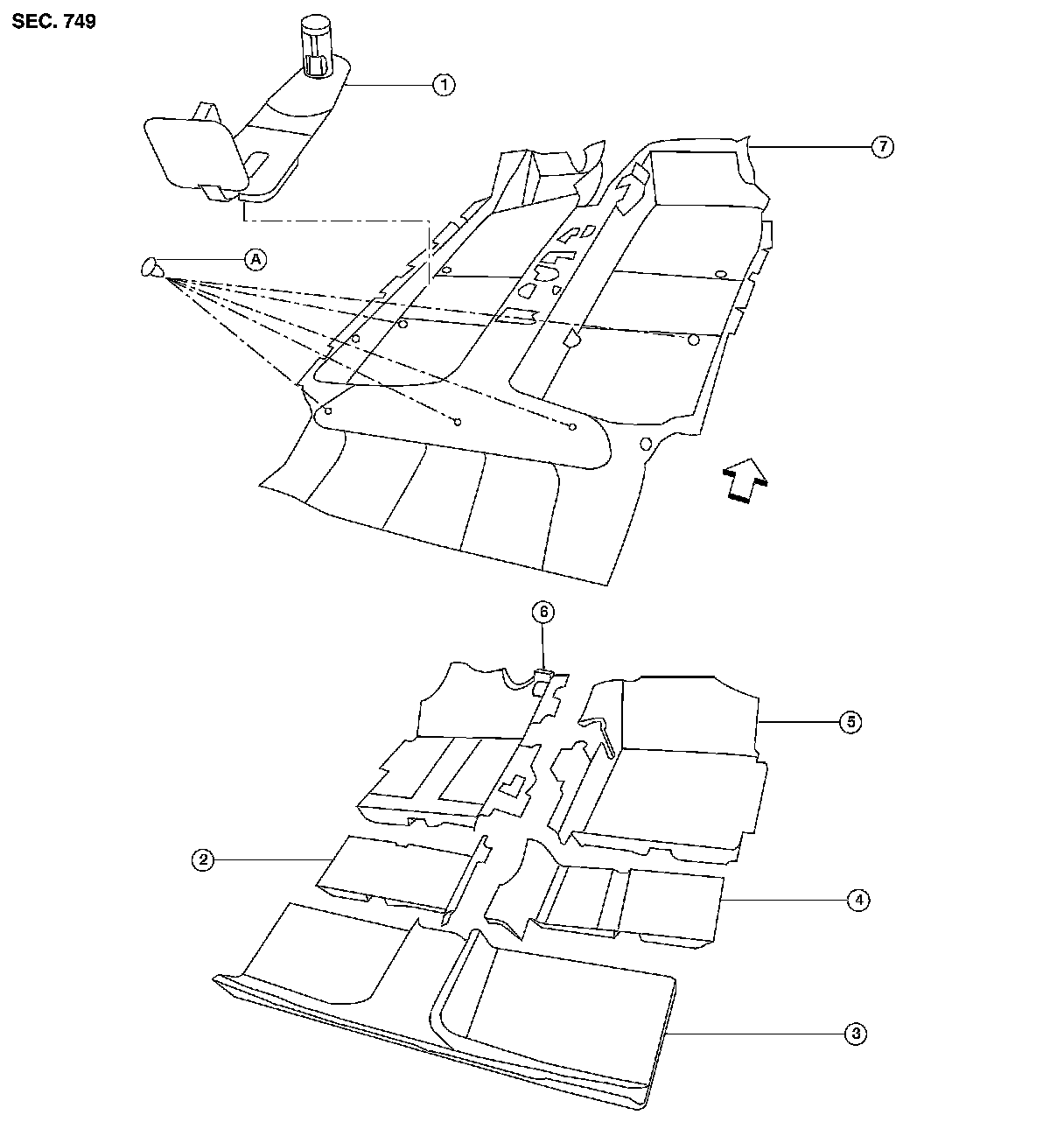 2. Remove front seat RH/LH and rear seat cushion. Driver Seat and Component Parts Drawing.