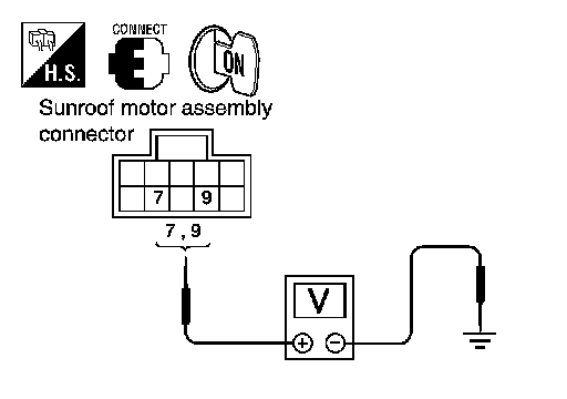 2. Check voltage between sunroof motor assembly connector R26 terminals 7, 9 and ground.