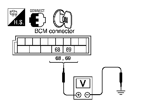 2. Check voltage between BCM connector M20 terminals 68, 69 and ground.