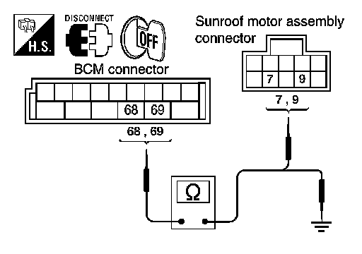 3. Check continuity between BCM connector M20 terminals 68, 69 and sunroof motor assembly connector R26 terminals 7, 9.