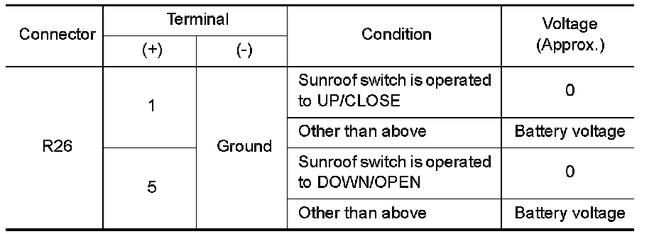 R26 terminals 1, 5 and sunroof switch connector R27 terminals