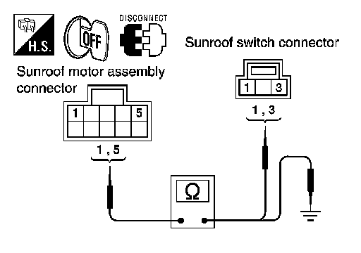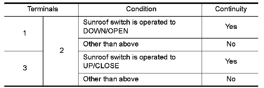 Check continuity between sunroof switch terminals 1, 3 and 2.
