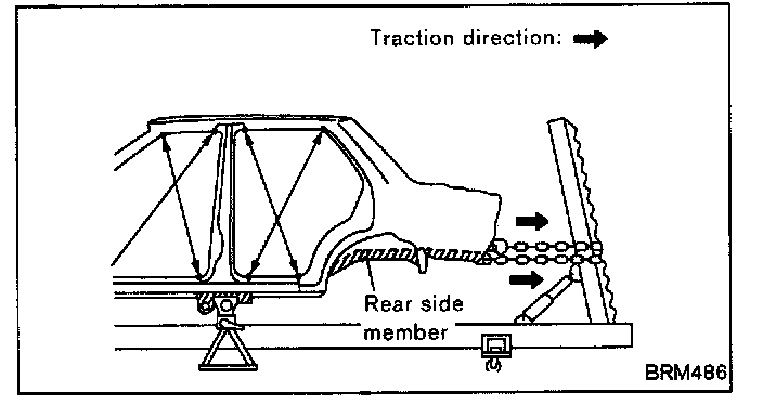 b. When straightening body panels, use caution in pulling any HSS panel. Because HSS is very strong, pulling may cause deformation in adjacent portions of the body. In this case, increase the number of measuring points, and carefully pull the HSS panel.