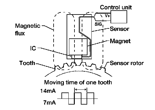 The front sensor units consist of a gear-shaped sensor rotor and a sensor element. The element contains a magnet around which a coil is wound. The front wheel sensors are installed on the front of the wheel knuckles. As the wheel rotates, the sensor generates a square-wave signal. The frequency increases as the wheel speed increases.