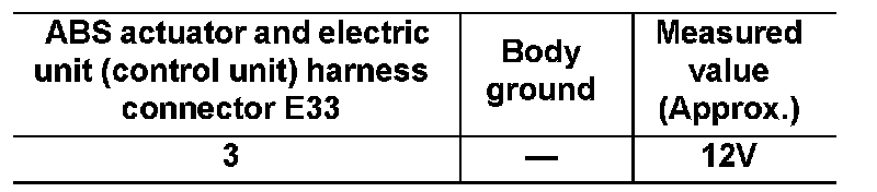 1. Check voltage between ABS actuator and electric unit (control unit) harness connector E33 and body ground.