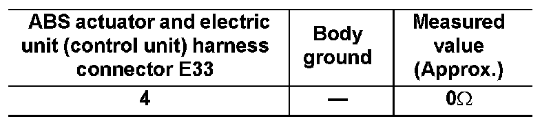2. Check resistance between ABS actuator and electric unit (control unit) harness connector E33 and body ground.