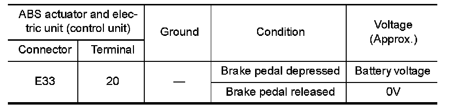 2. Check voltage between ABS actuator and electric unit (control unit) connector E33 terminal 20 and ground.
