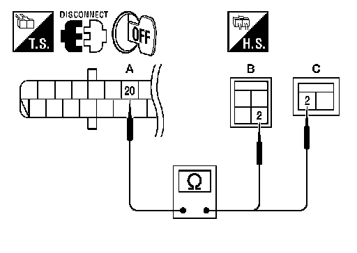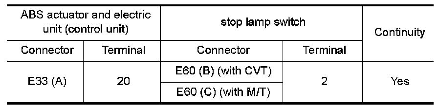 2. Check continuity between ABS actuator and electric unit (control unit) connector E33 (A) terminal 20 and stop lamp switch connector E60 (B) terminal 2 (with CVT), or E60 (C) terminal 2 (with M/T).