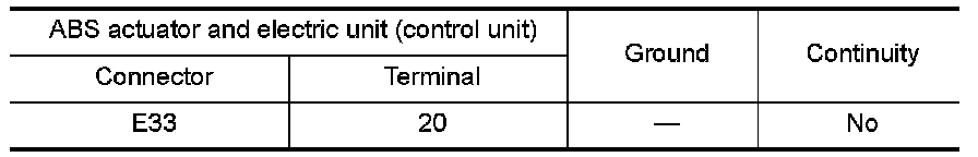 Check continuity between ABS actuator and electric unit (control unit) connector E33 terminal 20 and ground.