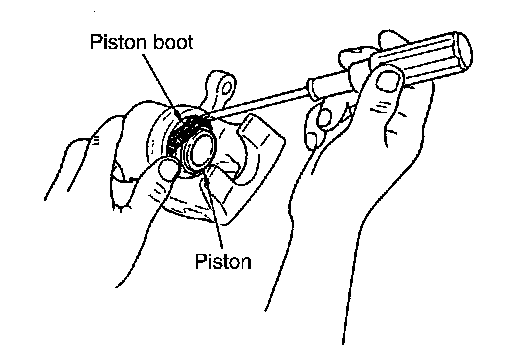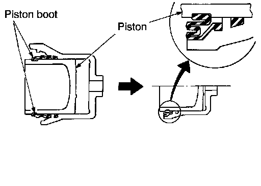 2. Apply rubber grease to new piston boot and apply brake fluid to piston. Cover the piston end with piston boot, and install cylinder-side lip on piston boot properly into groove on cylinder body using a suitable tool.