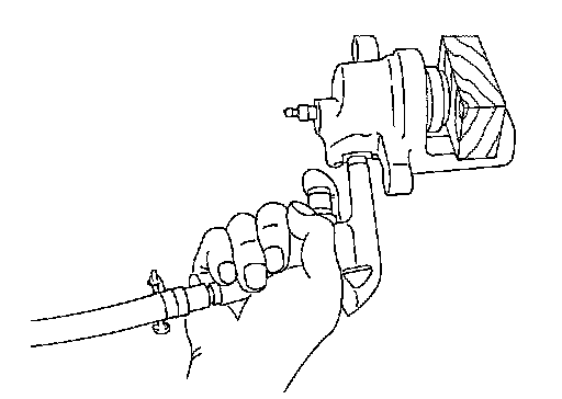 4. Place a wooden block as shown, and blow air from union bolt hole to remove piston and piston boot.