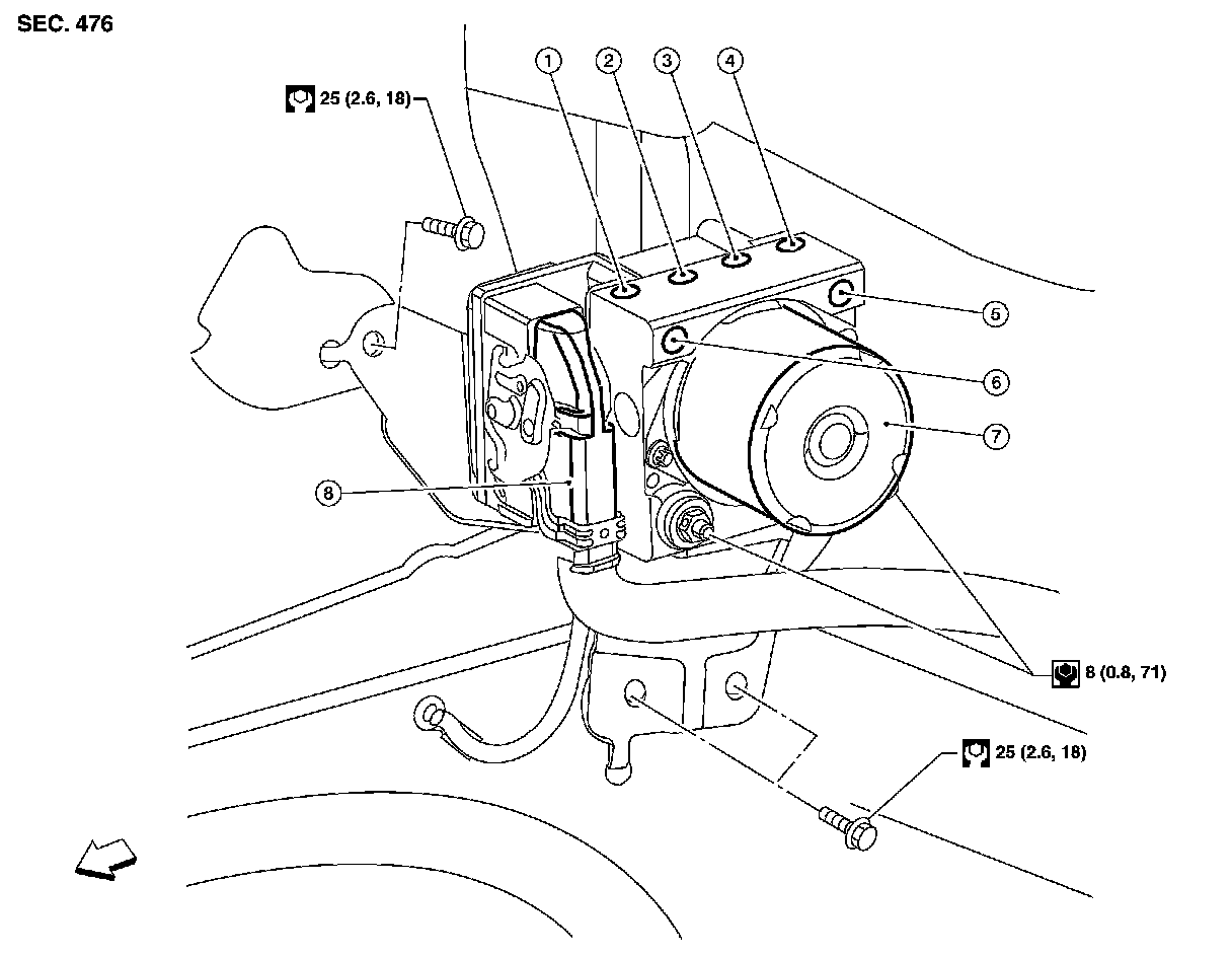 6. Remove ABS actuator and electric unit (control unit) bracket bolts.