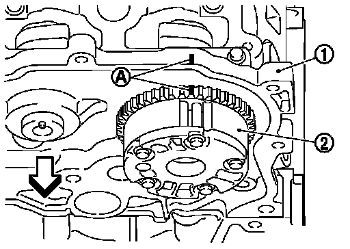 When the camshaft sprocket (INT) (2) is removed, align the paint mark (A) put according to step "8". Securely align the knock pin and the pin hole, and then install them.