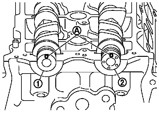 - Install camshafts so that camshaft dowel pins (A) on the front side are positioned as shown.