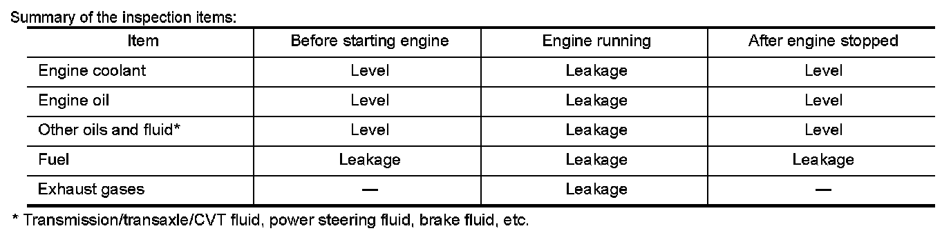 The following are procedures for checking fluids leak, lubricates leak.