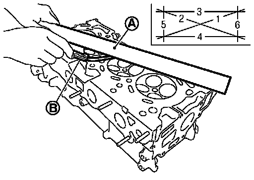 2. At each of several locations on bottom surface of cylinder head, measure the distortion in six directions using straightedge (A) and feeler gauge (B).