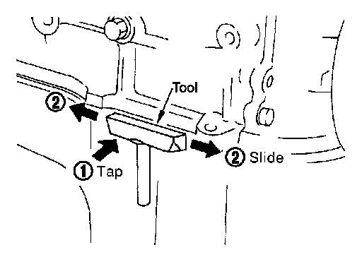 - Slide (1) the Tool by tapping (2) its side with a hammer to remove the upper oil pan from the cylinder block.