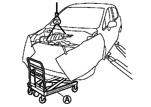 35. Use a manual lift table caddy (A) or equivalently rigid tool such as a transmission jack. Securely support bottom of the engine and the transaxle, and simultaneously adjust hoist tension.