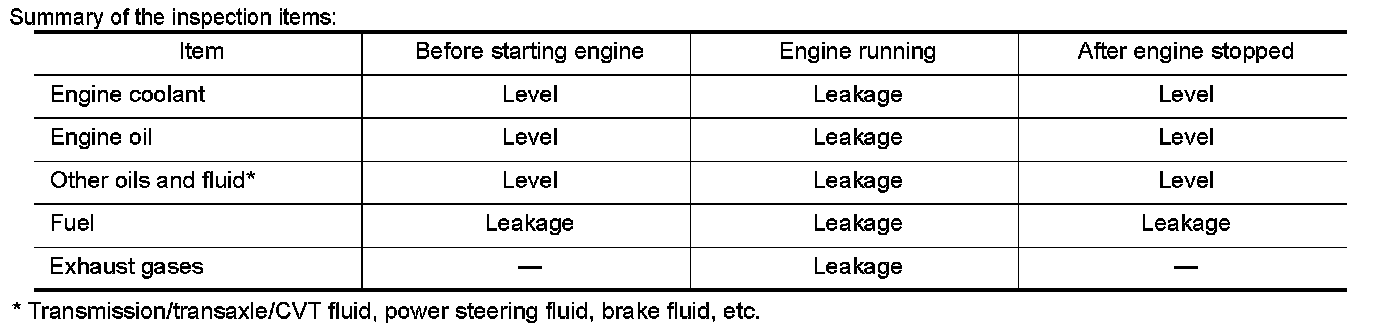The following are procedures for checking fluids leak, lubricates leak and exhaust gases leak.