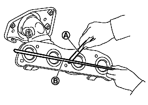 - Using straightedge (B) and feeler gauge (A), check the surface distortion of exhaust manifold mating surface in each exhaust port and entire part.