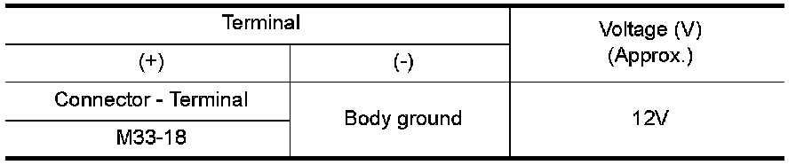 2. Check voltage between front air control harness connector M33 terminal 1 and ground.