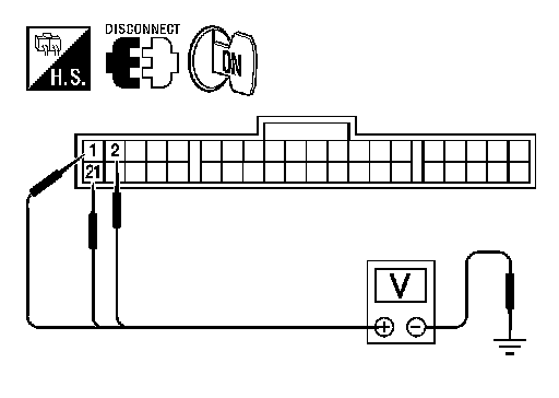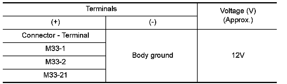 3. Check voltage between front air control connector M33 terminals 1, 2, and 21, and ground.