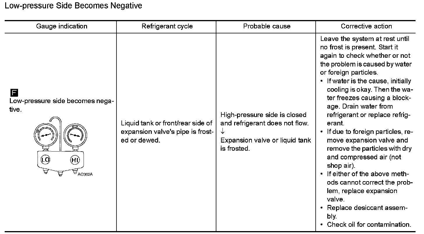 Whenever system's high and/or low side pressure is abnormal, diagnose using a manifold gauge. The marker above the gauge scale in the following tables indicates the standard (normal) pressure range. Since the standard (normal) pressure differs from vehicle to vehicle, refer to Ambient Air Temperature-to-operating Pressure