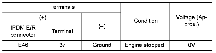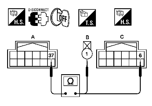 2. Check continuity between IPDM E/R harness connector E46 (A) terminal 37 and oil pressure switch harness connector F32 (B) terminal 1 (with MR20DE) or double meter connector M89 (C) terminal 6 (with QR25DE).