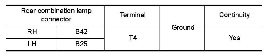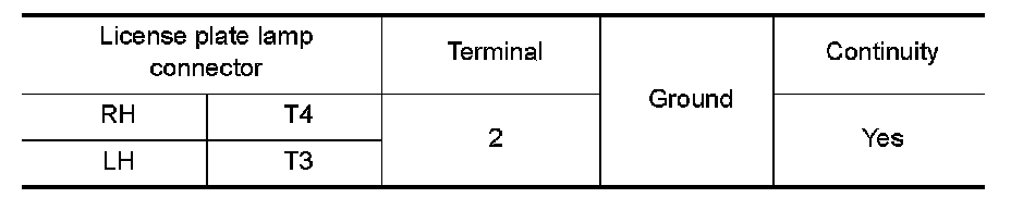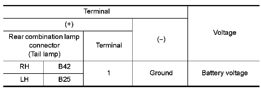 5. When tail lamp relay is operating, check voltage between license plate lamp and rear combination lamp harness connectors and ground.