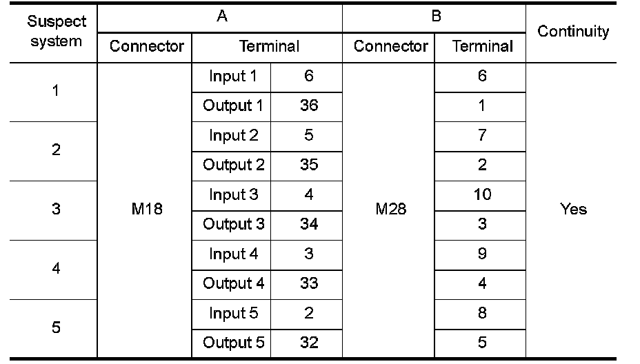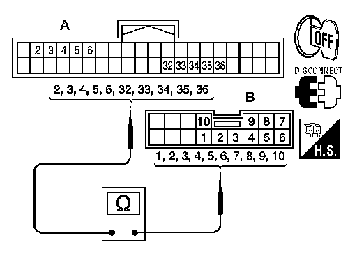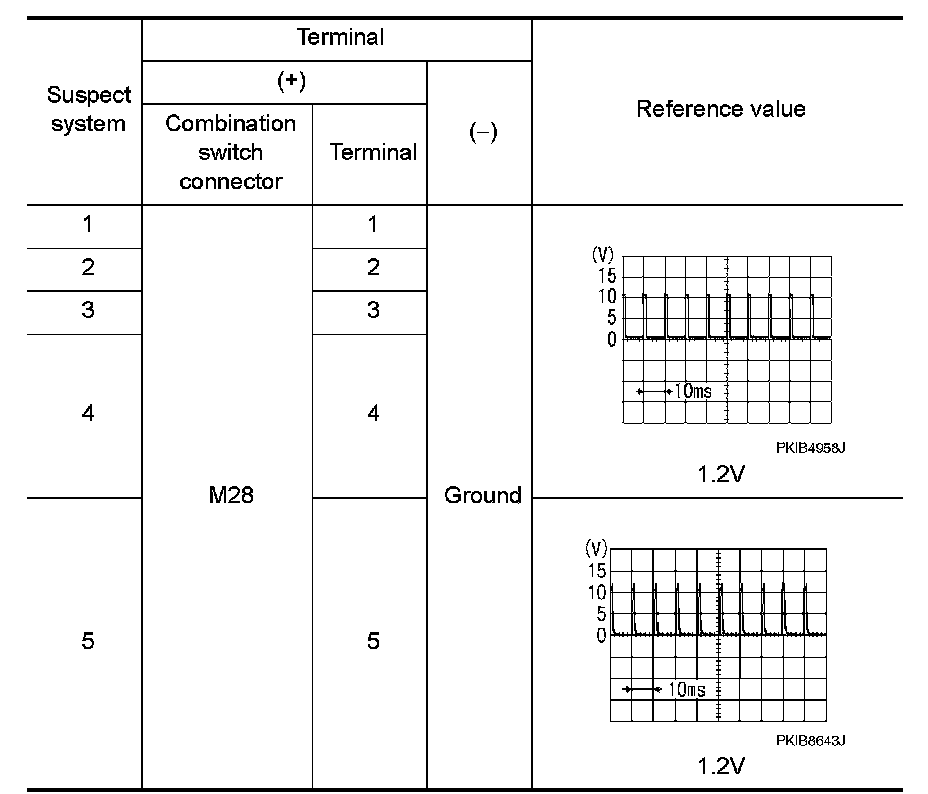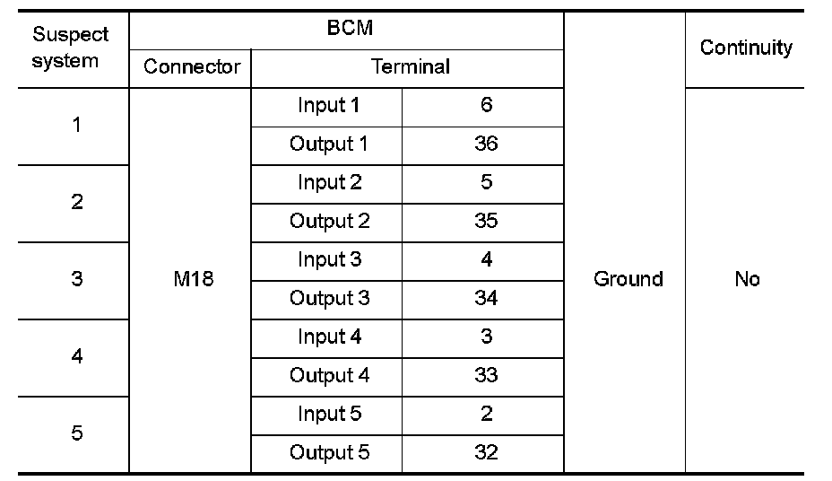 3. Check for continuity between BCM harness connector of the suspect system and the corresponding combination switch harness connector.